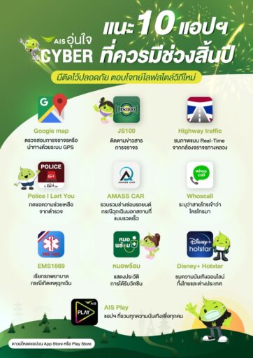 AIS อุ่นใจ Cyber ในฐานะเพื่อนคู่คิดดิจิทัลเพื่อคนไทยทุกเจนเนอเรชัน จึงขอแนะนำ10 แอปพลิชั่นที่จะทำให้ใช้การใช้งานออนไลน์ในช่วงเทศกาลปีใหม่ดียิ่งขึ้น สอดรับกับทุกดิจิทัลไลฟ์สไตล์ และเที่ยวอย่างปลอดภัยในยุคนี้ ประกอบด้วย Google map : ใช้สำหรับตรวจสอบการจราจรหรือนำทางไปยังจุดหมายต่าง ๆ ด้วยระบบ GPS, JS100 : แอปฯ ที่รวบรวมบริการข่าวสารของสถานีวิทยุ จส.100 อาทิ ติดตามข่าวสารการจราจร, Highway traffic: แอปฯที่สามารถแสดงภาพแบบ Real-Time จากกล้องจราจรทางหลวงในประเทศไทย, Police I Lert You: แอปฯที่สามารถกดขอความช่วยเหลือจากตำรวจได้ตลอด 24 ชั่วโมง