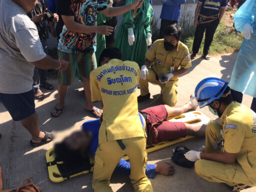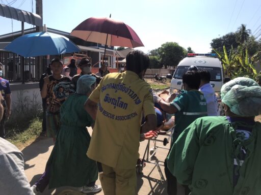 เจ้าหน้าที่สมาคมกู้ภัยข่าวภาพช่วยกันนำร่างของ นายสุฑน อายุ 39 ปี ที่ถูกไฟฟ้าช็อตหมดสติอยู่บนเสาไฟฟ้าลงมาปั้มหัวใจยื้อชีวิต หลังพลาดถูกไฟฟ้าช็อตขณะขึ้นไปพาดสายไฟจากบ้านที่ก่อสร้างใหม่เพื่อรอมิเตอร์ของการไฟฟ้า ก่อนไปเสียชีวิตที่โรงพยาบาล
