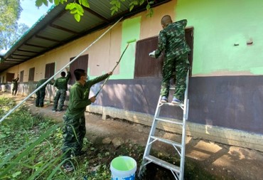 ขั้นตอนที่ 2 การปฏิบัติตามแผน : ได้ดำเนินการตามแผนงานที่วางไว้ร่วมกับครู นักเรียน ส่วนราชการและประชาชนในพื้นที่ ในการซ่อมแซม/ปรับปรุงสาธารณูปโภคพื้นฐานที่จำเป็น โดยเน้นการใช้ประโยชน์ อำนวยความสะดวกในชีวิตประจำวันและการศึกษาเล่าเรียนของนักเรียน เช่น การเปลี่ยนก๊อกน้ำ อุปกรณ์ไฟฟ้า เป็นต้น รวมทั้งการปลูกผัก และการเลี้ยงสัตว์ โดยมีวัตถุประสงค์หลักในการผลิตวัตถุดิบที่มีคุณภาพที่จะนำมาประกอบอาหารกลางวันให้กับเด็กนักเรียน และการสร้างกระบวนการเรียนรู้การดำเนินการตามโครงการทหารพันธุ์ดี ในการทำเกษตรอินทรีย์เพื่อลดต้นทุนการผลิต และการผลิตวัตถุดิบที่ปลอดสารพิษเพื่อสร้างกระบวนการเรียนรู้ให้กับ ครู นักเรียน และประชาชนในชุมชนรอบโรงเรียน และ ขั้นตอนที่ 3 การพัฒนาไปสู่ความยั่งยืน : มีจุดมุ่งหมายหลักในการส่งมอบโครงการให้โรงเรียนดำเนินการ โดยมีหน่วยเป็นผู้ประสานงานและให้คำปรึกษา รวมทั้งการขยายองค์ความรู้ไปสู่ชุมชนรอบโรงเรียน เพื่อให้เด็กนักเรียนมีอาหารที่มีคุณค่าทางโภชนาการรับประทานครบทั้ง 3 มื้อ และเกิดความยั่งยืนในชุมชุน โดยมีโรงเรียนเป็นศูนย์กลางในการเรียนรู้