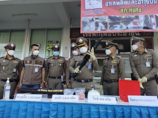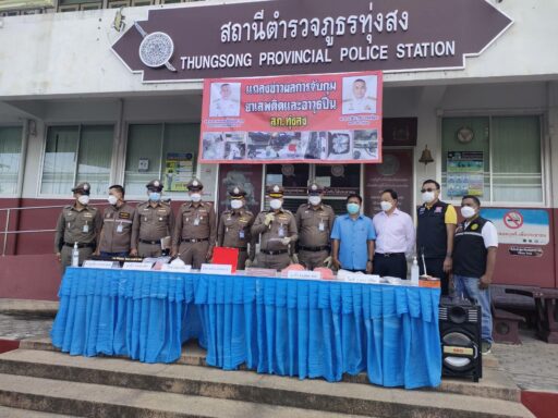 เมื่อเวลา 10.00 น.วันที่ 28มค.2564 ที่หน้า สภ.ทุ่งสง จ.นครศรีธรรมราช พล.ต.ต.สมชาย ซื่อต่อตระกูล ผบก.ภ.จ.นครศรีธรรมราช และ พ.ต.อ.ธีระวุฒิ เทพเลื่อน ผกก.สภ.ทุ่งสง ร่วมกันแถลงข่าวผลงานของตำรวจสืบสวน สภ.ทุ่งสง และ กก.สส.ภ.จว.นครศรีธรรมราช จับกุมผู้ต้องหายาเสพติดรายสำคัญรายใหญ่ในพื้นที่ อ.ทุ่งสง ได้แก่ นายสมศักดิ์ อินทรสุวรรณ หรือฉายา”มัน นาหลวงเสน” อายุ36 ปี พร้อมของกลางยาบ้า 3,844เม็ด ยาไอซ์ 900 กรัม อาวุธปืนจำนวน 2 กระบอก คือ 9 มม. 1 กระบอก อาวุธปืนลูกซองยาวแบบแม็กกาซีนจำนวน 1 กระบอก พร้อมกระสุนจำนวนหนึ่ง เครื่องชั่งดิจิตอลจำนวน 1 เครื่อง โดยจับกุมได้ที่หมู่บ้านเหมือนฝัน เลขที่ 421/93 หมู่บ้านเหมือนฝัน ต.ปากแพรก อ.ทุ่งสง จ.นครศรีธรรมราช จากนั้นทางตำรวจชุดดังกล่าวได้ขยายผลไปจับกุม นายสุทธิชัย แก้วสุวรรณ อายุ 32ปี เครือข่ายเดียวกันได้ที่บริเวณริมถนนสามแยกบ้านจำปา ต.ถ้ำใหญ่ อ.ทุ่งสง พร้อมของกลางยาบ้าเพิ่มอีก 56,000เม็ด และยาไอซ์ 2.9 กก.