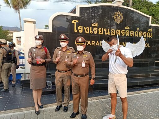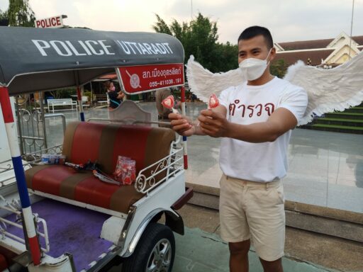 ตำรวจ สภ.เมืองอุตรดิตถ์ แจกอมยิ้มรูปหัวใจแทนใบสั่ง แถมยังถอดเครื่องแบบชุดตำรวจ มาในชุดคิวปิด วันวาเลนไทน์ 14 กุมภาพันธ์