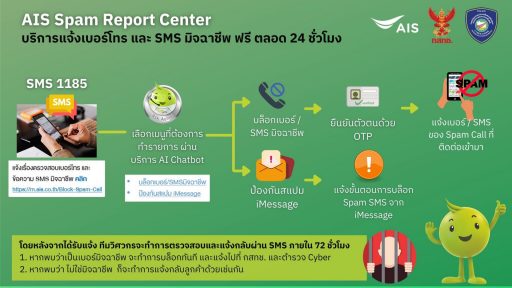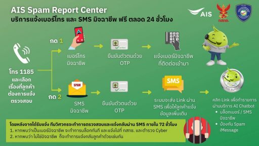 เอไอเอสปกป้องลูกค้าจากกลุ่มมิจฉาชีพและแก๊งคอลเซ็นเตอร์ เปิดศูนย์รับเรื่องร้องเรียนเบอร์โทรและ SMS มิจฉาชีพ ผนึกกำลังตำรวจไซเบอร์ รับแจ้ง ตรวจสอบข้อมูลภายใน 72 ชั่วโมง พร้อมดำเนินคดีตามกฎหมายขั้นสูงสุด