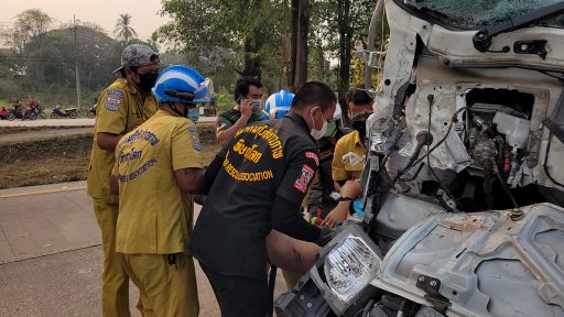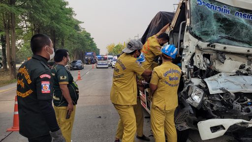 เจ้าหน้าที่สมาคมกู้ภัยข่าวภาพใช้อุปกรณ์ตัดถ่างนำร่างคนขับและผู้โดยสารออกจากซากรถยนต์บรรทุกหกล้อออกมาให้ตำรวจชันสูตร หลังขับชนท้ายรถบรรทุกพ่วง 18 ล้ออย่างจังบนถนนพิษณุโลก – นครสวรรค์ หมู่ 6 ต.บ่อทอง อ.บางระกำ จ.พิษณุโลก เบื้องต้นตำรวจคาดคนขับรถหกล้อหลับใน