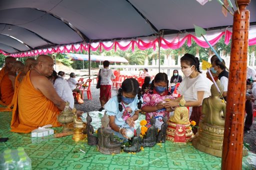 ต่อมาเวลา 13.00 น. มีการประกอบพิธีตามประเพณีสงกรานต์ มีพระสงฆ์สวดเจริญพระพุทธมนต์ เพื่อความสิริมงคล ก่อนจะให้ผู้ที่ร่วมงาน ร่วมสรงน้ำพระพุทธรูป พระสงฆ์ และผู้สูงอายุ ตามลำดับ ซึ่งปีนี้ทางพระมหาอารยัน อานันโท เจ้าอาวาสวัด มีการออกแบบสถานที่รดน้ำผู้สูงอายุ แบบเว้นระยะห่าง ตามมาตราการฯ ป้องกันการแพร่ระบาด มีการนำต้นไผ่ที่ปลูกบริเวณวัด มาดัดแปลงเป็นรางพระธรรม จำนวน 39 ราง แต่ละรางเว้นระยะห่าง 1.5 เมตร เพื่อให้ลูกหลาน และผู้ร่วมงาน ร่วมรดน้ำผู้สูงอายุทั้ง 39 คน ตามประเพณีสงกรานต์ ปีใหม่ไทย ซึ่งบรรยากาศเป็นไปด้วยความเรียบร้อย