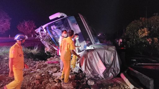 เมื่อเวลา 04.30 น. วันที่ 18 เม.ย. ร.ต.ท.ณัฐชัย ศักดิ์บูรณาเพชร รอง สว.(สอบสวน) สภ.เมืองพิษณุโลก รับแจ้งมีอุบัติเหตุรถทัวร์พลิกคว่ำริมถนนสายบายพาสสี่แยกหนองอ้อ – สี่แยกอินโดจีน ใกล้กับศูนย์ซ่อมสีและตัวถังมาตรฐานทีเอ็น หมู่ที่ 2 ตำบลบึงพระ อำเภอเมือง จังหวัดพิษณุโลก มีผู้บาดเจ็บจำนวนหลายราย ไปตรวจสอบพร้อมด้วยเจ้าหน้าที่สมาคมกู้ภัยข่าวภาพ พิษณุโลก พบรถทัวร์สีฟ้าขาว ทะเบียน 12-8688 กทม. ต้นทางกรุงเทพฯ ปลายทาง จ.น่าน ของบริษัทบุษราคัม ยี่ห้อเบนซ์ พลิกคว่ำตะแคงซ้ายอยู่ในร่องริมถนนและส่วนหัวรถทับรถยนต์เก๋งที่จอดคลุมผ้าไว้เพื่อรอการซ่อมของศูนย์ซ่อมสีและตัวถังมาตรฐานทีเอ็น ซึ่งจอดอยู่หน้าศูนย์ได้รับความเสียหายเล็กน้อย