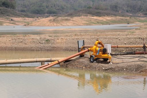 สูบน้ำลงท่อส่งน้ำที่เขื่อนดินช่องเขาขาดช่วยผู้ประสบภัยแล้ง