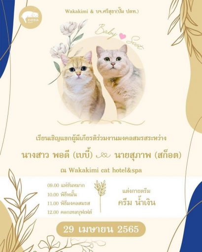 เมื่อวันที่ 27 เมษายน ในโลกออนไลน์ปรากฏภาพป้ายเชิญร่วมงานมงคลสมรสแมวเพศเมียชื่อ “เบบี้” และแมวเพศผู้ชื่อ “สก็อต” ซึ่งจะมีขึ้นในวันที่ 29 เม.ย.นี้ ได้กลายเป็นกระแสร้อนแรง ในโลกออนไลน์ ผู้สื่อข่าวจึงเดินทางไปสอบถาม น.ส.ฐิติพร วริทธนันท์ เจ้าของโรงแรมและสปาแมวสไตล์ญี่ปุ่น wakakimi ตั้งอยู่ที่ ถ.ธรรมบูชา ซอย 5 อ.เมือง จ.พิษณุโลก ทราบว่า เรื่องราวความรักของเจ้าแมวเหมี่ยว เพศเมียชื่อ “เบบี้” และแมวเพศผู้ชื่อ “สก็อต” นั้น โดยเจ้า“สก็อต” เป็นลูกชายคนเล็ก ของโรงแรมแมว wakakimi แห่งนี้ และได้พบรักกับสาวลูกของ เลโก้ เพื่อนรักที่เติบโตมาด้วยกันที่โรงแรมแห่งนี้ หรือจะเรียกว่าเป็นเพื่อนร่วมสาบานกับพ่อเจ้าสาวเลยก็ว่าได้ ด้วยเหตุนี้ทำให้ สก็อต ลูกชายคนเล็กของเจ้าของโรงแรมซึ่งเป็นเจ้าบ่าวรู้จักคุ้นเคยกันตั้งแต่เจ้าสาวยังเล็ก ๆ จากความใกล้ชิดจึงกลายเป็นความรัก ทำให้ตกลงวิวาห์กันในที่สุด และมีกำหนดจัดงานในวันที่ 29 เม.ย. เวลา 09.00 น. ภายในงานจะมีการกั้นประตูประตูทองเหมือนกับคนจริงๆ และผู้ร่วมงานซึ่งจะเป็นแมวก็จะได้ของชำร่วยที่เตรียมไว้คือ ที่ตักขี้แมวและถุงใส่ขี้แมวแบบรักษ์โลก เป็นของที่ระลึก ซึ่งบรรดาทาสแมวที่จะนำแมวมาร่วมงานแต่งงานก็รู้จักเป็นอย่างดี และจะมีจุดให้ผู้เอาแมวมาร่วมงานได้ถ่ายรูปคู่กับเจ้าบ่าวเจ้าสาวด้วย