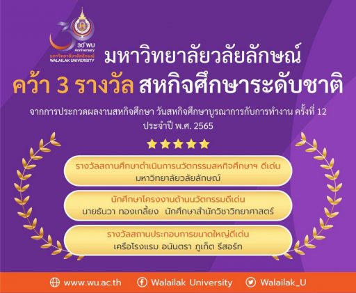 มหาวิทยาลัยวลัยลักษณ์คว้า 3 รางวัล สหกิจศึกษาดีเด่นระดับชาติ ประเภทสถานศึกษาสหกิจศึกษาดีเด่น โครงงานสหกิจศึกษาดีเด่น และรางวัลสถานประกอบการสหกิจศึกษาขนาดใหญ่ดีเด่น ระบุหลังปรับรูปแบบสหกิจศึกษาเป็น 8 เดือน เพิ่มโอกาสเรียนจบมีงานทำเพิ่มมากขึ้น