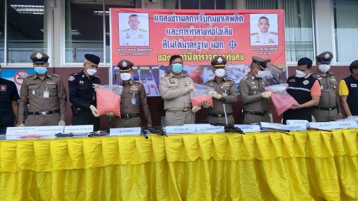 เมื่อเวลา 09.00น.วันที่ 16มิ.ย.2565 ที่บริเวณหน้า สภ.ทุ่งสง จ.นครศรีธรรมราช พล.ต.ต.สมชาย ซื่อต่อตระกูล ผบก.ภ.จ.นครศรีธรรมราช นายถิรนาถ เอสะนาชาตัง นายอำเภอทุ่งสง พ.ต.อ.ธีระวุฒิ เทพเลื่อน ผกก.สภ.ทุ่งสง พร้อมด้วย พ.อ.สมศักดิ์ สุกใส หน.ฝ่ายสารวัตรทหาร มทบ.43, ตัวแทน ตชด.กก.42, จนท.ปปส.ภาค 8 ร่วมกันแถลงข่าวผลงานการกวาดล้างจับกุมยาเสพติดของตำรวจ สภ.ทุ่งสง ภายใต้การนำของ พ.ต.อ.ธีระวุฒิ เทพเลื่อน ผกก.สภ.ทุ่งสง ได้มีการจับกุมผู้ต้องหายาเสพติดรายสำคัญพื้นที่ อ.ทุ่งสง จำนวน 3 รายประกอบด้วย นายเทวราช ธานีรัตน์, นายเจนณรงค์ ธนาวุฒิ และนายธีระวุฒิหรือเนตร แทนชนะ ซึ่งเป็นเครือข่ายยาเสพติดรายใหญ่ในพื้นที่ อ.ทุ่งสง จ.นครศรีธรรมราช โดยจับกุมได้พร้อมยาบ้ารวมจำนวน 146,636เม็ด พร้อมของกลางรถ จยย.จำนวน 2 คัน และ จนท.ปปส.ภาค 8 อยู่ระหว่างการตรวจสอบยึดทรัพย์สินของแก๊งยาเสพติดแก๊งนี้ตามหลังต่อไป