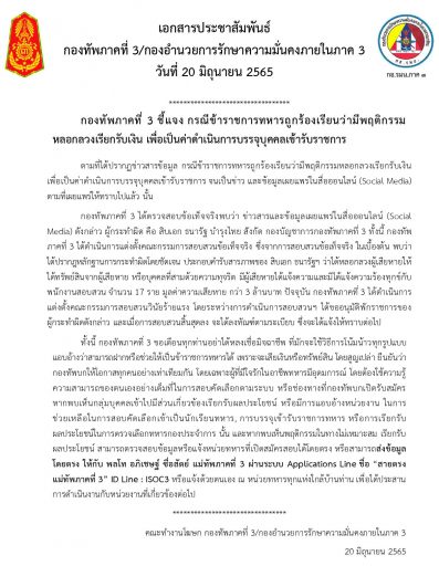 กองทัพภาคที่ 3 ชี้แจง กรณีข้าราชการทหารถูกร้องเรียนว่ามีพฤติกรรมหลอกลวงเรียกรับเงิน เพื่อเป็นค่าดำเนินการบรรจุบุคคลเข้ารับราชการ