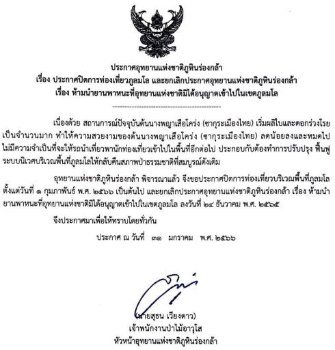 อุทยานแห่งชาติภูหินร่องกล้าประกาศปิดการท่องเที่ยวภูลมโลเพื่อให้ธรรมชาติฟื้นตัว ให้กลับคืนสภาพป่าธรรมชาติที่สมบูรณ์ดังเดิม หลังต้นนางพญาเสือโคร่งหรือซากุระเมืองไทยเริ่มผลิใบและดอกร่วงโรยเป็นจำนวนมากทำให้ความสวยงามของต้นนางพญาเสือโคร่งลดน้อยลงและหมดไป
