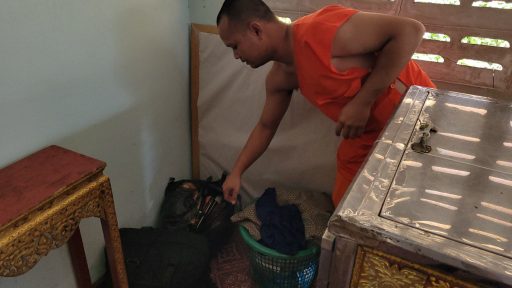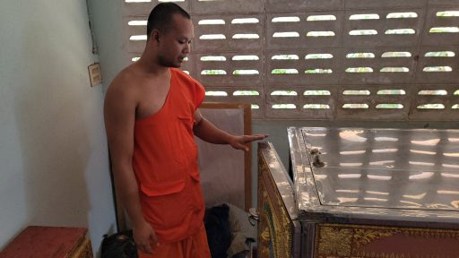 ด้าน พระกอร์ปเกื้อ พระลูกวัดเปิดเผยว่า ตอนเช้าจะมาเปิดศาลาให้โยม มาเปลี่ยนข้าวและเช็คโลงเย็นตามกิจวัตรปกติ แล้วเห็นถุงใส่เสื้อผ้าของผู้เสียชีวิตถูกรื้อค้น เลยตรวจดูรอบศาลาก็เห็นหน้าต่างหลังศาลาเปิดอยู่ โลงเย็นก็ถูกเปิดเหมือนคนร้ายต้องการจะเอาเงินในมือศพ ปกติคนร้ายจะมานอนอยู่ในวัดเป็นประจำ ข้างโบสถ์บ้าง ข้างศาลาบ้าง มีการตากเสื้อผ้าไว้บริเวณห้องน้ำของวัด เป็นคนในหมู่บ้านไม่ใช่คนเร่ร่อนแต่เป็นคนตกงานอายุประมาณ 40 – 45 ปี มีพฤติกรรมดื่มสุราภายในวัด ทางวัดก็ตักเตือนและท้วงติงเมื่อหยิบของในงานศพไป บางทีเจ้าภาพงานศพก็ไล่ไปก็หายไปจากวัดได้ 2 – 3 วันก็กลับมาใหม่ เจ้าภาพบางงานไม่ทราบนึกว่าเป็นคนของวัดก็ให้ช่วยยกเก้าอี้เรียงเก้าอี้ให้ พอเจ้าภาพเผลอก็หยิบของเค้าไป เปิดประตูโลงเย็นเอาเงินในมือศพหรือของมีค่าที่ญาติวางไว้บนศพไปก็มี เบื้องต้นตำรวจได้ให้ผู้ใหญ่บ้านเข้าแจ้งความกับพนักงานสอบสวน เพื่อจะได้ติดตามตัวคนร้ายรายนี้มาดำเนินคดีตามกฎหมายต่อไป