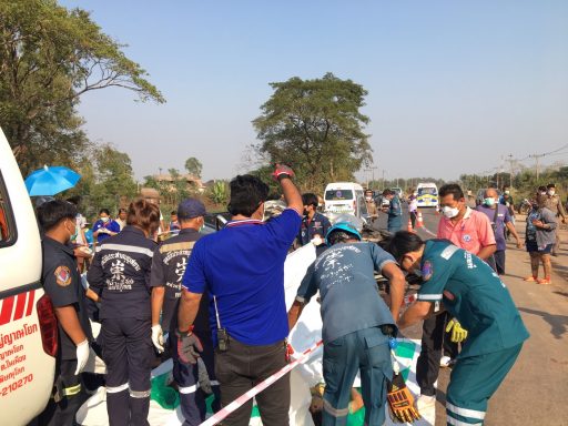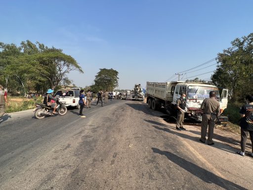 เมื่อเวลา 15.30 น. วันที่ 23 ก.พ.2566 พ.ต.ท.สิทธิศักดิ์ ธรรมสุขสรรค์ รอง ผกก.(สอบสวน) สภ.บางกระทุ่ม จ.พิษณุโลก รับแจ้งมีเหตุรถยนต์บรรทุกสิบล้อชนกับรถยนต์กระบะทำให้มีผู้บาดเจ็บและผู้เสียชีวิตหลายรายติดอยู่ในซากรถ บนถนนทางหลวงแผ่นดินหมายเลข 1114 สายบางกระทุ่ม – เนินกุ่ม พื้นที่บ้านบึงช้าง หมู่ที่ 10 ต.ไผ่ล้อม ไปตรวจสอบพร้อมด้วยแพทย์เวร รพ.บางกระทุ่ม และเจ้าหน้าที่หน่วยกู้ภัยพิษณุโลก มูลนิธิประสาทบุญสถาน พบรถยนต์กระบะยี่ห้อนิสสัน ฟรอนเทียร์ (แค็บ) สีบรอนซ์ หมายเลขทะเบียน ถก 6355 กรุงเทพมหานคร สภาพพังยับเยินอยู่กลางถนน มีร่างผู้เสียชีวิตติดอยู่ในซากรถจำนวน 3 ราย และมีผู้บาดเจ็บอาการสาหัส 1 รายอยู่บริเวณที่นั่งในแค็บด้านหลังที่นั่งข้างคนขับ เจ้าหน้าที่กู้ภัยจึงรีบนำตัวออกจากรถส่งให้แพทย์ทำการรักษาตัวเร่งด่วนที่ รพ.บางกระทุ่ม ทราบชื่อคือ น.ส.พรศิริ ศิลางาม อายุ 19 ปี อยู่บ้านเลขที่ 45/12 หมู่ 1 ต.เนินกุ่ม อ.บางกระทุ่ม จ.พิษณุโลก ตำรวจจึงให้เจ้าหน้าที่กู้ภัยใช้อุปกรณ์ตัดถ่างนำร่างผู้เสียชีวิตทั้งหมดออกมาชันสูตร ทราบชื่อผู้เสียชีวิตคือ นายพิษณุ เจือโร่ง นางอำพัน พินิจ และ น.ส.ขวัญตา พินิจ ยังไม่ทราบอายุ ทั้งหมดเป็นชาวบ้าน ต.เนินกุ่ม อ.บางกระทุ่ม จ.พิษณุโลก