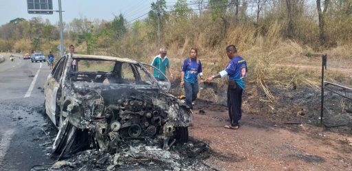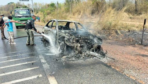 พ่อเฒ่ากลับจากงานเลี้ยงรุ่นขับรถเก๋งกลับบ้านไฟลุกไหม้เสียหายทั้งคัน