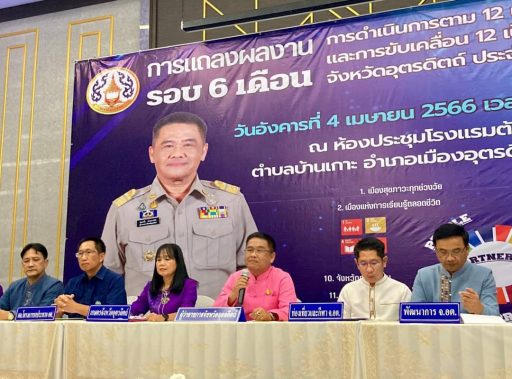 เมื่อเวลา 15:30 น. วันที่ 4 เมษายน 2566.ที่โรงแรมต้นทองรีสอร์ท อำเภอเมือง จังหวัดอุตรดิตถ์ นายสมหวัง พ่วงบางโพ ผู้ว่าราชการจังหวัดอุตรดิตถ์ นำส่วนราชการที่เป็นหน่วยงานหลักในการดำเนินงานตาม 12 เป้าหมายของจังหวัด แถลงผลงาน การดำเนินงานในรอบ 6 เดือนแรก โดย ผวจ.อุตรดิตถ์ กล่าวขอบคุณทุกภาคส่วน ทั้งภาครัฐ ภาคเอกชน องค์กรปกครองส่วนท้องถิ่น อสม. อพม. เครือข่ายรัฐวิสาหกิจ อำเภอทุกอำเภอ ผู้นำชุมชน อาสาสมัครฯ และพี่น้องประชาชนทุกคน ที่ร่วมด้วย ช่วยกัน ขับเคลื่อน 12 เป้าหมายร่วมจังหวัดอุตรดิตถ์ แบบบูรณาการร่วมกัน จนเกิดประโยชน์กับพี่น้องประชาชนสูงสุด