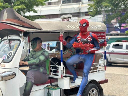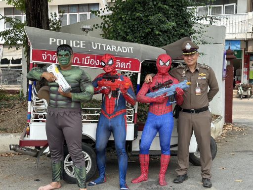 เมื่อวันที่ 12 เมษายน 2566 พ.ต.อ.สมเกษม จารักษ์ ผกก.สภ.เมืองอุตรดิตถ์ นำเจ้าหน้าที่ตำรวจใส่ชุด “อเวนเจอร์ส” เช่น ฮัท สไปเดอร์แมน ไอ้แมงมุม พร้อมปืนฉีดน้ำ ลงพื้นที่ให้ความรู้และแนะนำวิธีการเล่นสงกรานต์ พร้อมนำรถจ๋าตุ๊ก (POLICE UTTARADIT) ตระเวนเล่นฉีดน้ำในเทศสงกรานต์ เพื่อสร้างสีสัน พร้อมดูแลประชาชน ในพื้นที่อำเภอเมือง ทั้งทางน้ำและทางบก เพื่อรักษาความปลอดภัยในชีวิต ทรัพย์สินของประชาชน ช่วงเทศกาลสงกรานต์ ในช่วง 7 วันอันตราย อย่างถูกวิธี