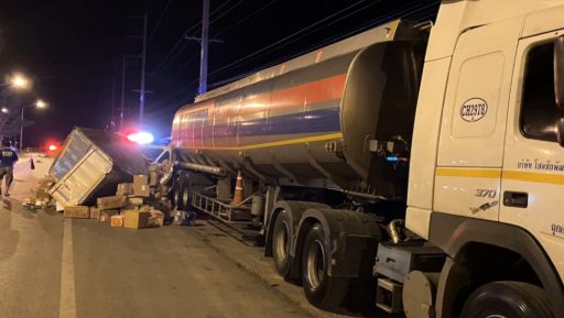 หนุ่มใหญ่ขับรถกระบะหลับในชนท้ายรถเทเลอร์จอดข้างทางบาดเจ็บ