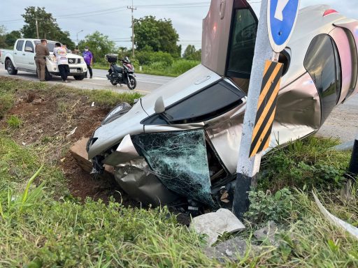 หนุ่มอุตรดิตถ์ขับเก๋งหลับในชนเสาไฟฟ้าดับคารถ