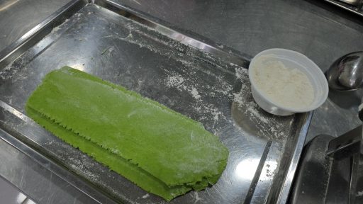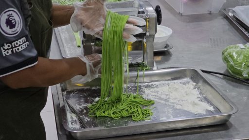สำหรับกระบวนการผลิตบะหมี่ผักปลัง เราต้องคัดใบผักปลังปลอดสาคเคมีที่ปลูกไว้ โดยเลือกใบที่ไม่อ่อนและไม่แก่เกินไปเพื่อความสวยงามของสีบะหมี่ จากนั้นนำมาปั่นให้ละเอียด ผสมกับแป้งบะหมี่ นวดให้น้ำผักกับแป้งเป็นเนื้อเดียวกัน จากนั้นนำไปผ่านเครื่องนวดเป็นแผ่นก่อนจะนำมาตัดเป็นเส้น นำไปต้ม และนำมาพักให้เย็น จากนั้นนำไปอบแห้งไล่ความชื้น จนเป็นเส้นบะหมี่ผักปลัง นำไปแพ๊คใส่ซองกันความชื้น 1 แพ๊ค จะมี 4 ซอง รวมน้ำหนัก 140 กรัม ราคาแพ๊คละ 70 บาท เวลาจะทานก็นำไปต้มในน้ำเดือดประมาณ 5-8 นาที จากนั้นนำไปปรุงอาหารได้ตามใจชอบ ส่วนใหญ่นิยมนำไปทำ บะหมี่ผักผัดขี้เมา บะหมี่ผักผัดโป๊ยเซียน ราดหน้าบะหมี่ผัก บะหมี่ผักผัดพริกแห้งเบค่อน บะหมี่ผักคาโบนาร่า สปาเก็ตตี้บะหมี่ผัก หรือเมนูอื่นๆ ดัดแปลงได้ตามใจชอบ