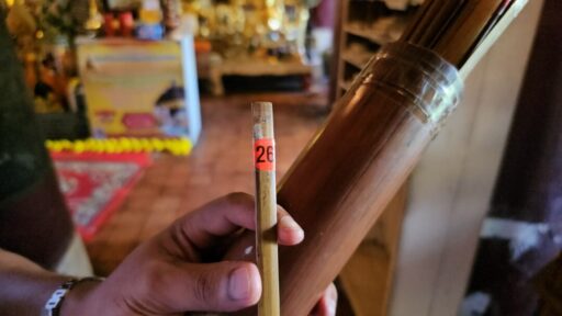 โดยหลังประกอบพิธีบวงสรวงภายในวิหารหลวงพ่อทองดำเสร็จสิ้นแล้ว เอก อนุภาพ นักร้องเพลง “วอนพระนางพญาองค์ใหญ่” หรือ “น้องเท่ห์” ที่อุทิศตนมารับใช้อาจารย์ลี เจ้าอาวาสวัดราชบูรณะ ได้ร้องเพลงสด ๆ ให้ผู้ที่มาเข้าร่วมพิธีได้รับฟังจนเป็นที่ประทับใจของทุกคน ก่อนที่บรรดาแฟนคลับจะขอให้น้องเท่ห์เขย่าเซียมซีขอเลขเด็ดเพื่อนำไปเสี่ยงโชคซื้อสลากกินแบ่งรัฐบาลงวดประจำวันที่ 16 ก.พ.นี้ โดยน้องเท่ห์เขย่าเซียมซีได้หมายเลข 26 ส่วนพราหณ์ที่มาเป็นเจ้าพิธีบวงสรวงเขย่าเซียมซีได้หมายเลข 9 ประชาชนและนักท่องเที่ยวที่มาร่วมพิธีและมาให้อาจารย์ลีลงยันต์อักขระ นะมะมนต์ นางพญาองค์ใหญ่ ต่างจดจำหมายเลขดังกล่าวเพื่อนำไปเสี่ยงโชคหวังได้รับโชคกันถ้วนหน้า ที่พลาดไม่ได้สำหรับคอหวยต่างพากันรีบไปซื้อสลากกินแบ่งรัฐบาลที่พ่อค้าแม่ค้ามาตั้งแผงจำหน่ายที่บริเวณด้านข้างวิหารทันที จนทำให้เลขสามตัวท้ายที่มีเลข 26 และ 9 หมดเกลี้ยงทุกแผง
