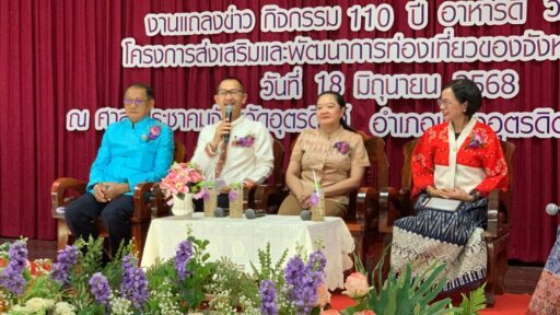 เมื่อเวลา 14.00 น. วันที่ 18 มิถุนายน 2568 ณ ศาลาประชาคม อ.เมือง จ.อุตรดิตถ์ นางสาวนิรชา บัณฑิตย์ชาติ รอง ผวจ.อุตรดิตถ์ พร้อมด้วย นายสุรพันธ์ เจริญทรัพย์ วัฒนธรรมจังหวัดอุตรดิตถ์ และ นายศักดิ์ตระกูล เลี้ยงประเสริฐ สภาวัฒนธรรมจังหวัดอุตรดิตถ์ /ผศ.ดร.รดี ธนารักษ์ รองอธิการบดีมหาวิทยาลัยราชภัฏอุตรดิตถ์ ร่วมกันแถลงข่าวการจัดงาน “110 ปี อาหารดี วิถีอุตรดิตถ์” / โดยมี นายสุรชัย วาณิชย์ปกรณ์ ประธานสภาอุตสาหกรรมจังหวัดอุตรดิตถ์/ นางจินดา มาแก้ว รองนายกเทศมนตรีเมืองอุตรดิตถ์/หัวหน้าส่วนราชการ แขกผู้มีเกียรติ สื่อมวลชน ร่วมงานแถลงข่าวในครั้งนี้